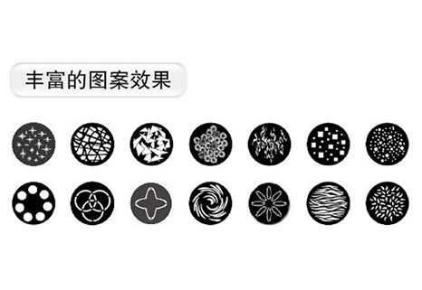 1个旋转图案盘,1个固定图案盘,14个可换图案片+白光,可安装玻璃图案片和金属图案片,可双向变速旋转,具有索引功能,变速抖动效果、双向变速流动效果