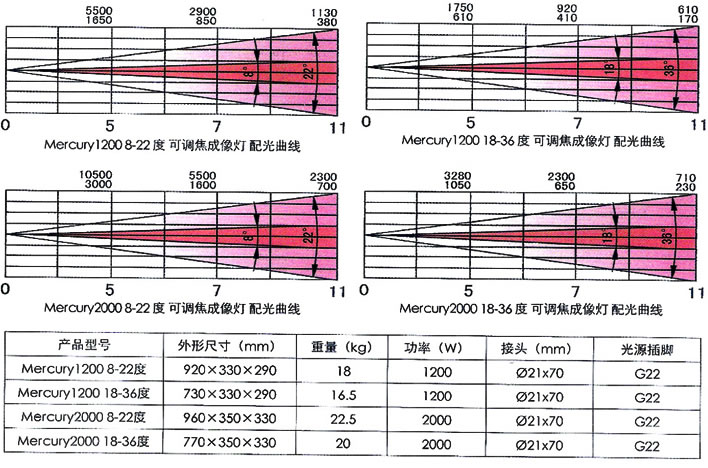 此灯采用3组消色差透镜,光束角为8-22°/18-36°,典型投射距离为7米-25米,反光杯采用透红外镀膜,反光杯反光效率高,整灯温度低,照度高,光斑均匀,无偏光、暗斑。