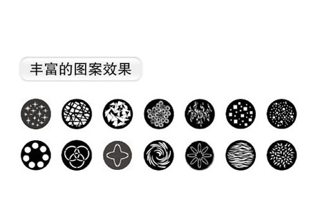 1个旋转图案盘,1个固定图案,14个可换图案片,可安装玻璃图案片和金属图案片,可双向变速旋转,具有索引功能,变速抖动效果、双向变速流动效果
