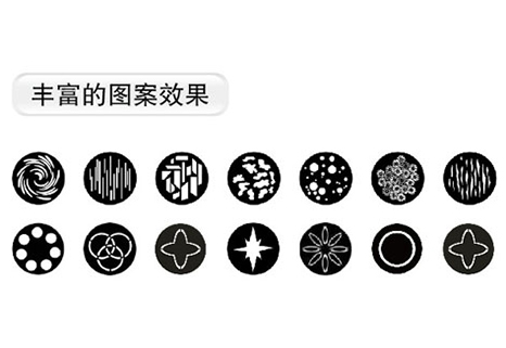 1个旋转图案盘,1个固定图案,7个可换图案片+白光,可安装玻璃图案片和金属图案片,可双向变速旋转,具有索引功能,变速抖动效果、双向变速流动效果