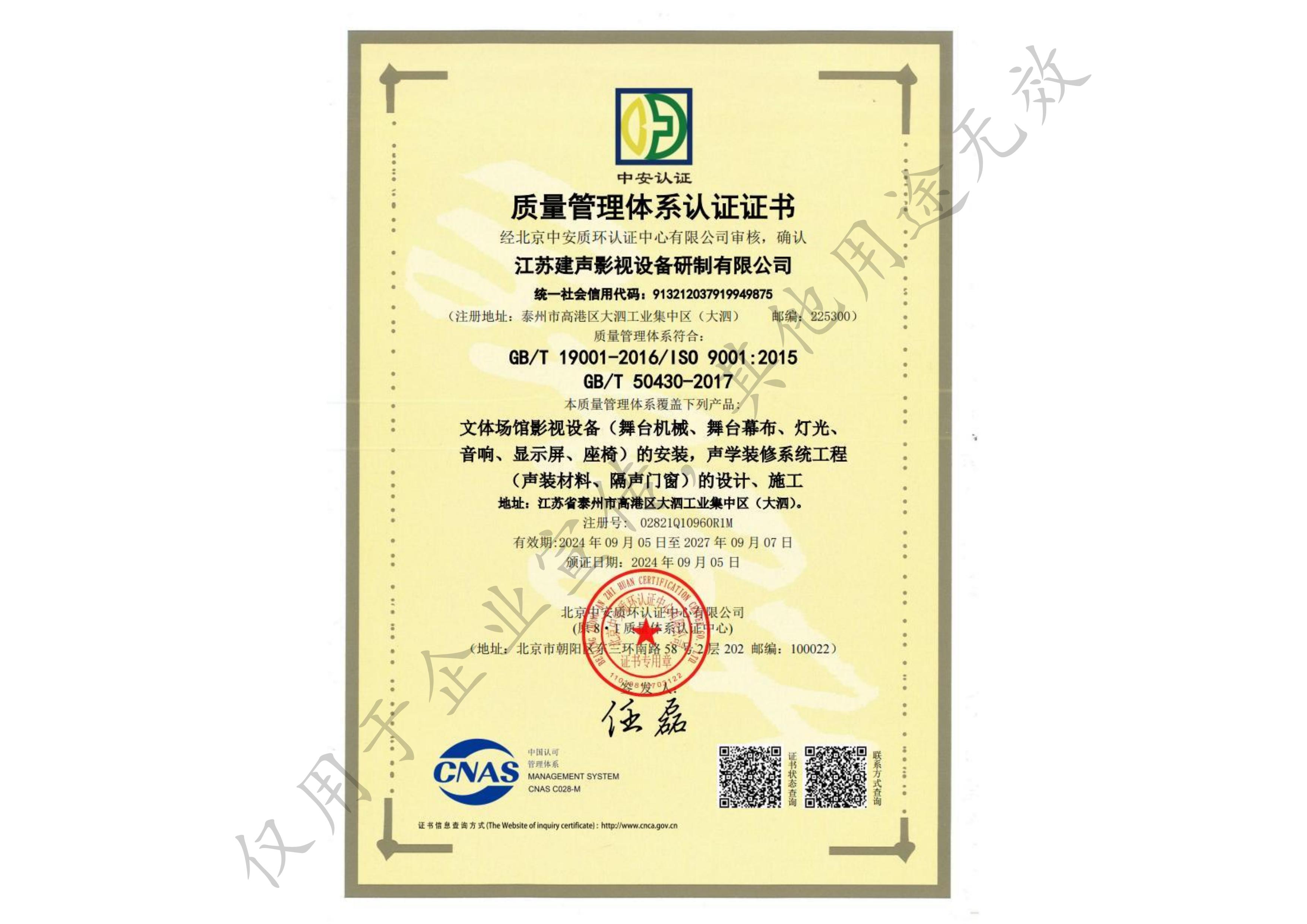 质量管理体系认证证书