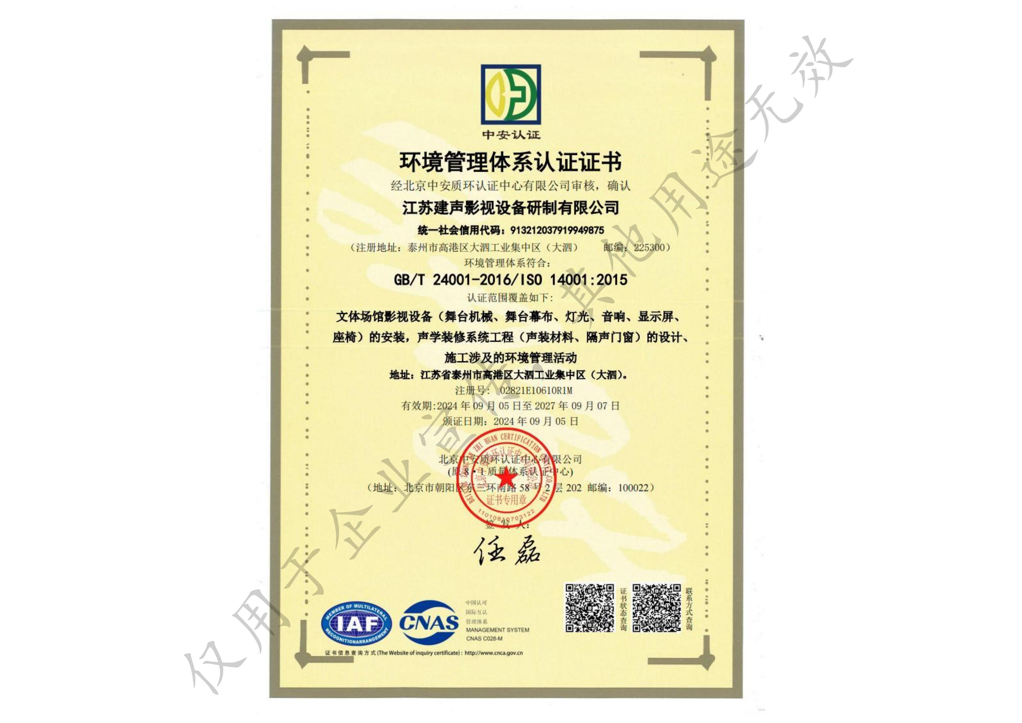 环境管理体系认证证书
