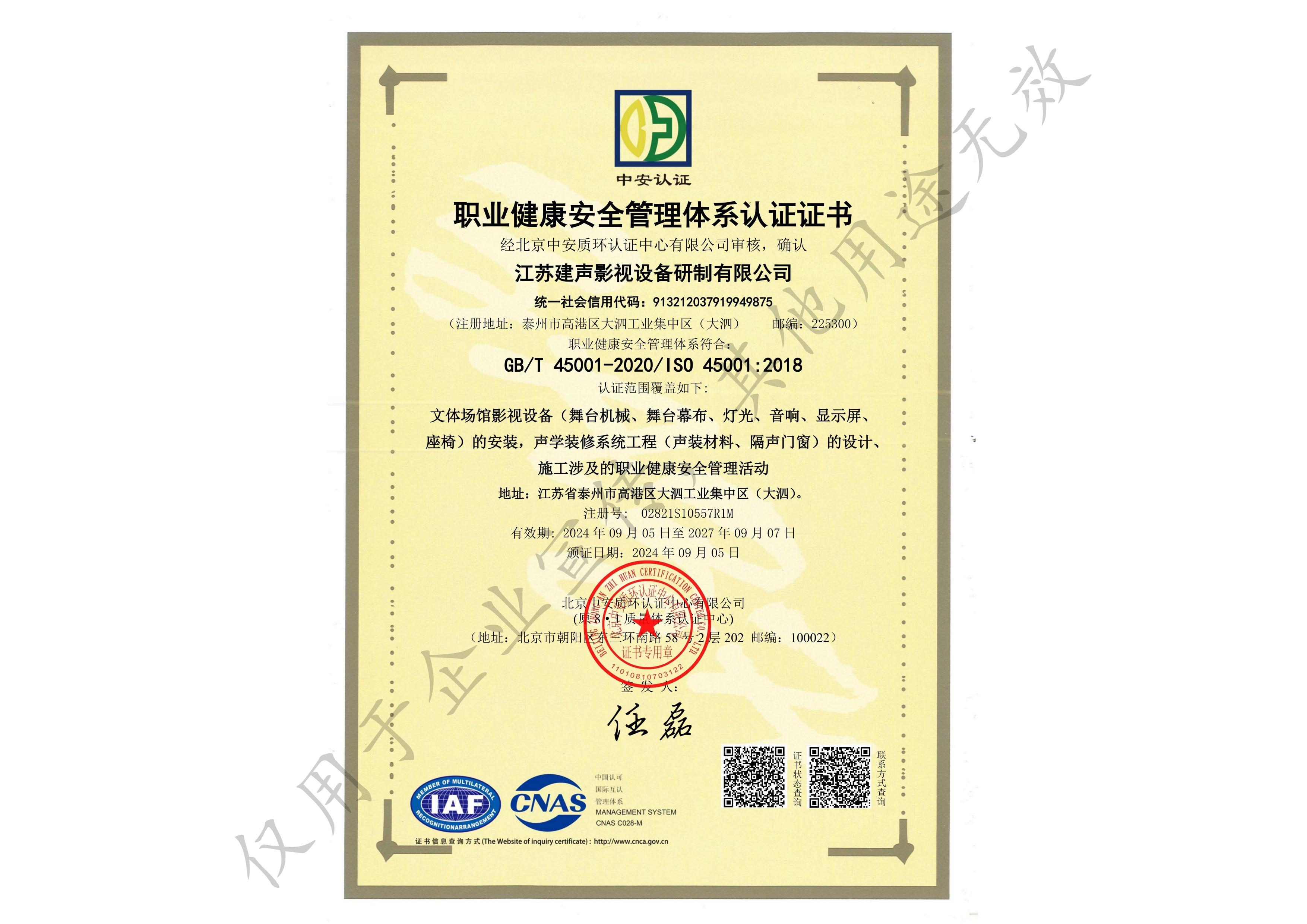职业健康管理体系认证证书
