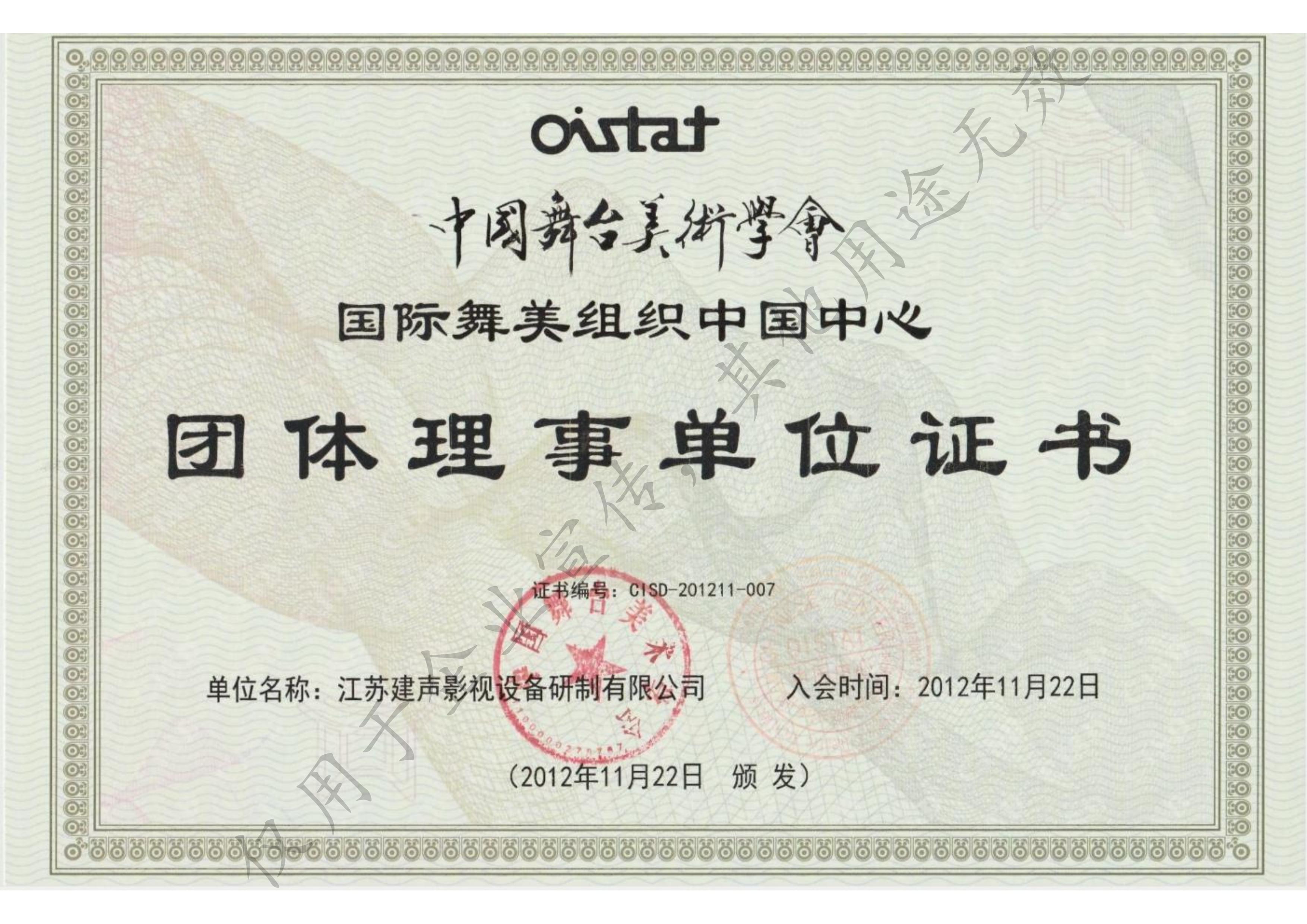 中国舞台美术学会理事单位证书
